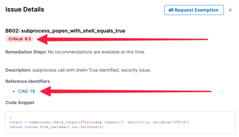 In the following step, you'll create an exemption for each of the two critical issues found: subprocess_popen_with_shell_equals_true (only in the current scan) and hashlib (common to the baseline scan).