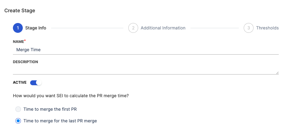 - Review the pre populated Stages that represent the PR lifecycle, from PR creation to merge. You can edit, add, and remove stages as needed. You can edit the data or fields that drive each stage, set time range goals, and more.
