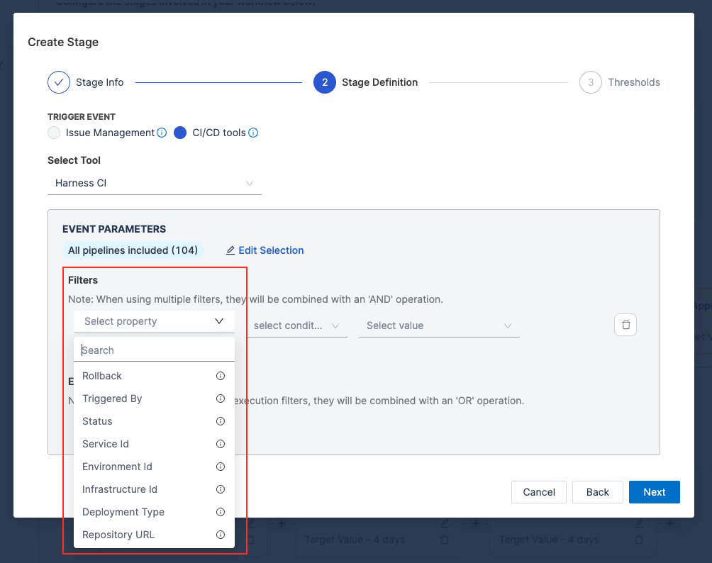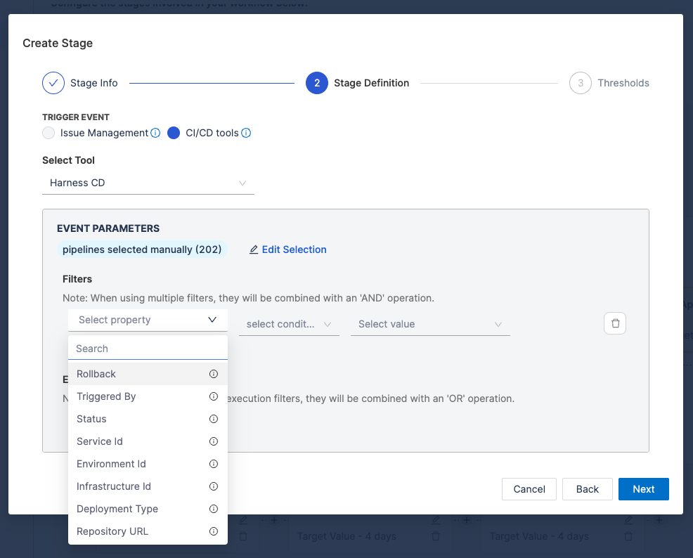 Use Filters to refine which executions are included in the stage. Filters refine which executions are included, leveraging pipeline properties from Harness CD configurations: