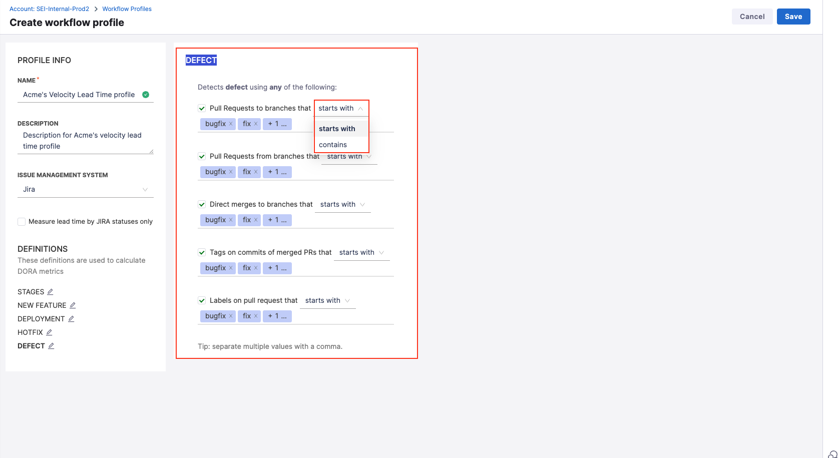 You can customize Workflow profile stages and thresholds to align with your team's Software Development Lifecycle (SDLC) processes. For profiles involving multiple tools like issue management, SCM, and CI/CD, avoid duplicate tracking of the same event (e.g., Deploy to Production in both Jira and CI/CD).